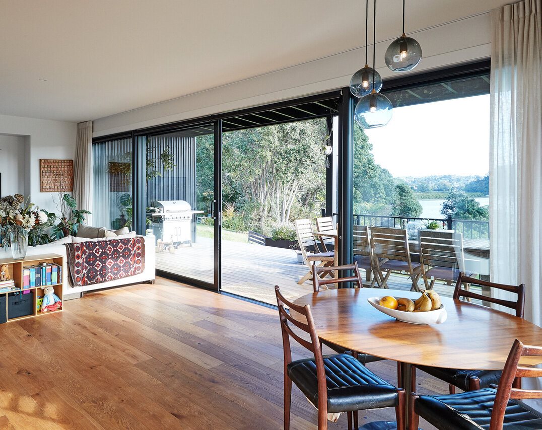 Oliver Driver, wife Ella Mizrahi and their two children embarked on a project to build their first home on a riverside section on the Te Atatu Peninsula. The family wanted a relaxed home that connected with the river and found large Vantage windows and doors throughout the home hit the mark.